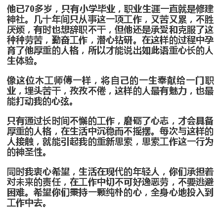 木匠工作的意義在哪里?它的意義不僅在于使用工具修筑漂亮的房屋,不僅在于提高木工技能,更在于磨煉人的心志,塑造人的靈魂——我在這位師傅的肺腑之言中聽出了這樣的意蘊。