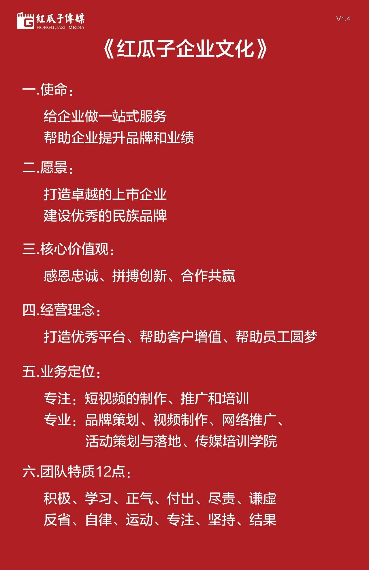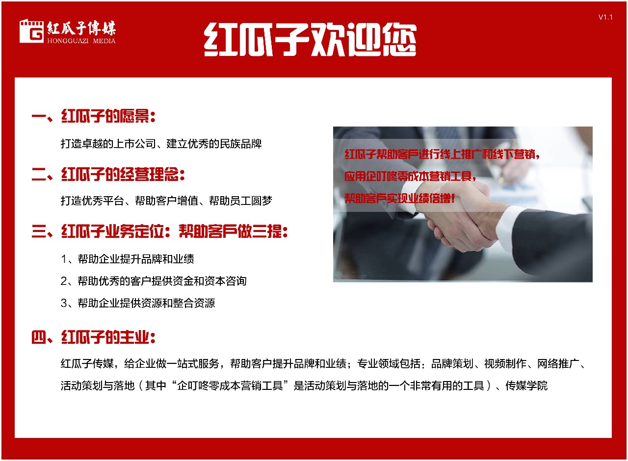 9、經(jīng)營理念:“打造優(yōu)秀平臺,幫助客戶增值、幫助員工圓夢”,這是寫在紅瓜子企業(yè)文化中的最重要的一條,未來的競爭是企業(yè)文化的競爭,企業(yè)文化對內(nèi)凝結(jié)人心,打造團(tuán)隊(duì),對外吸引客戶,組成同盟,現(xiàn)在已經(jīng)是營銷3.0時代,企業(yè)文化是優(yōu)秀供應(yīng)商評估的重要指標(biāo),紅瓜子企業(yè)文化的理念是打造優(yōu)秀平臺,幫助客戶增值、幫助員工圓夢,客戶的認(rèn)同和體驗(yàn)感是紅瓜子最重要的追求
