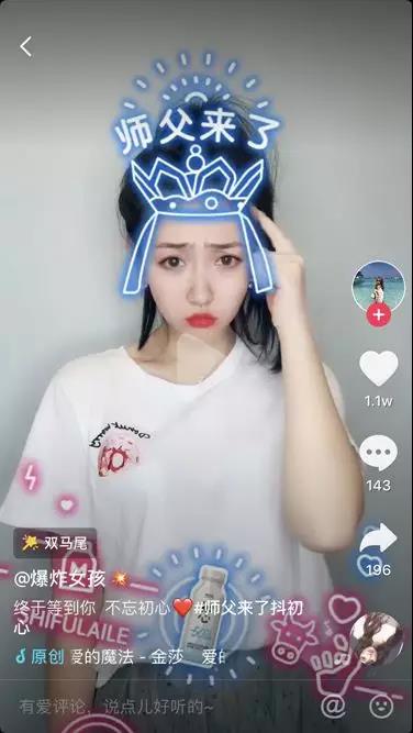 酷炫的燈管風(fēng),右下角不斷冒出小心心,整個(gè)貼紙動(dòng)態(tài)呈現(xiàn)。當(dāng)你炫技完成,向鏡頭比心時(shí),“師父來(lái)了”四個(gè)字就被觸發(fā),特效貼紙畫面隨之到來(lái)。