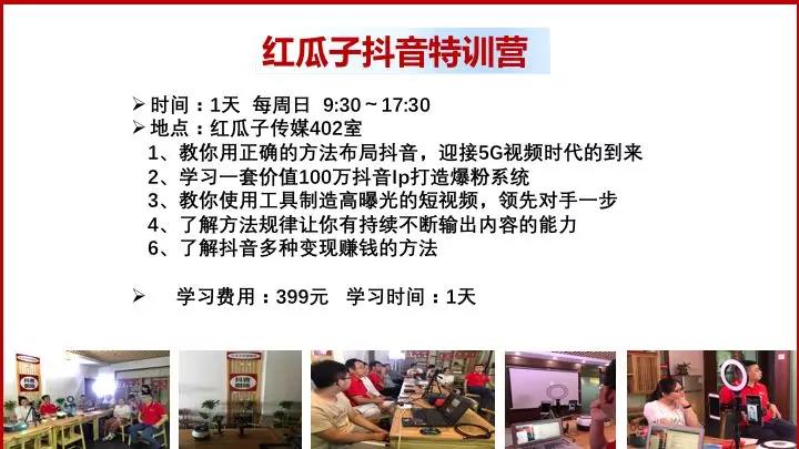 5G時代來臨,信息以短視頻形式來傳播,抖音是全球短視頻流量最大的平臺,沃爾瑪一條抖音增加2000萬收入,一條抖音為華為手機單店增加650萬收入,怎樣用好抖音,對我們個人和公司都非常重要,紅瓜子抖音研究院每天都有組織《抖音劇場》節目和每周日都舉行《抖音特訓營》培訓,歡迎大家積極參加。
