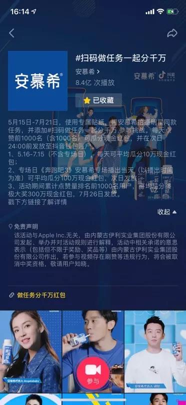 5月15日-7月21日,打開抖音掃描【安慕希x抖音】新包裝二維碼,完成指定任務(wù)并在當(dāng)天24:00前按要求在抖音平臺(tái)上傳任務(wù)視頻。點(diǎn)贊排名前1000名(包括第1000名)即可瓜分現(xiàn)金紅包。本次傳播巧妙的以產(chǎn)品為開頭,將傳播的核心基于產(chǎn)品,讓線下購(gòu)買行為反饋到線上UGC內(nèi)容,互動(dòng)內(nèi)容同時(shí)與品牌產(chǎn)生聯(lián)名款產(chǎn)品進(jìn)行閉環(huán)式的營(yíng)銷。