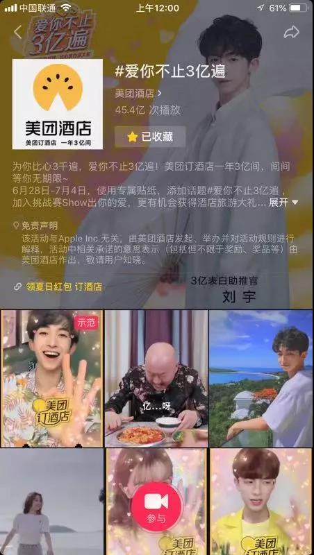 2019年,美團酒店的年預定間數已增長至3億。為傳遞這一信息,品牌繼續搶占抖音開屏、發現頁banner、熱搜榜、站內信等核心入口,啟用郭冬臨、劉宇等明星為品牌助陣,并策劃#愛你不止3億遍 熱門話題,搶占用戶關注。在獲取更高流量的同時,美團酒店在互動玩法上進行升級。一方面在品牌貼紙中應用體感識別技術,可根據用戶的手勢觸發特定動態效果。新鮮有趣的玩法在一周內,吸引17萬用戶使用該帖紙上傳視頻,作為一款帶有明確商業信息的貼紙,互動量驚人。另一方面,品牌在達人視頻中加入Link組件,可直接將用戶引流至H5聚合頁,打通跳轉路徑,提升轉化效果。