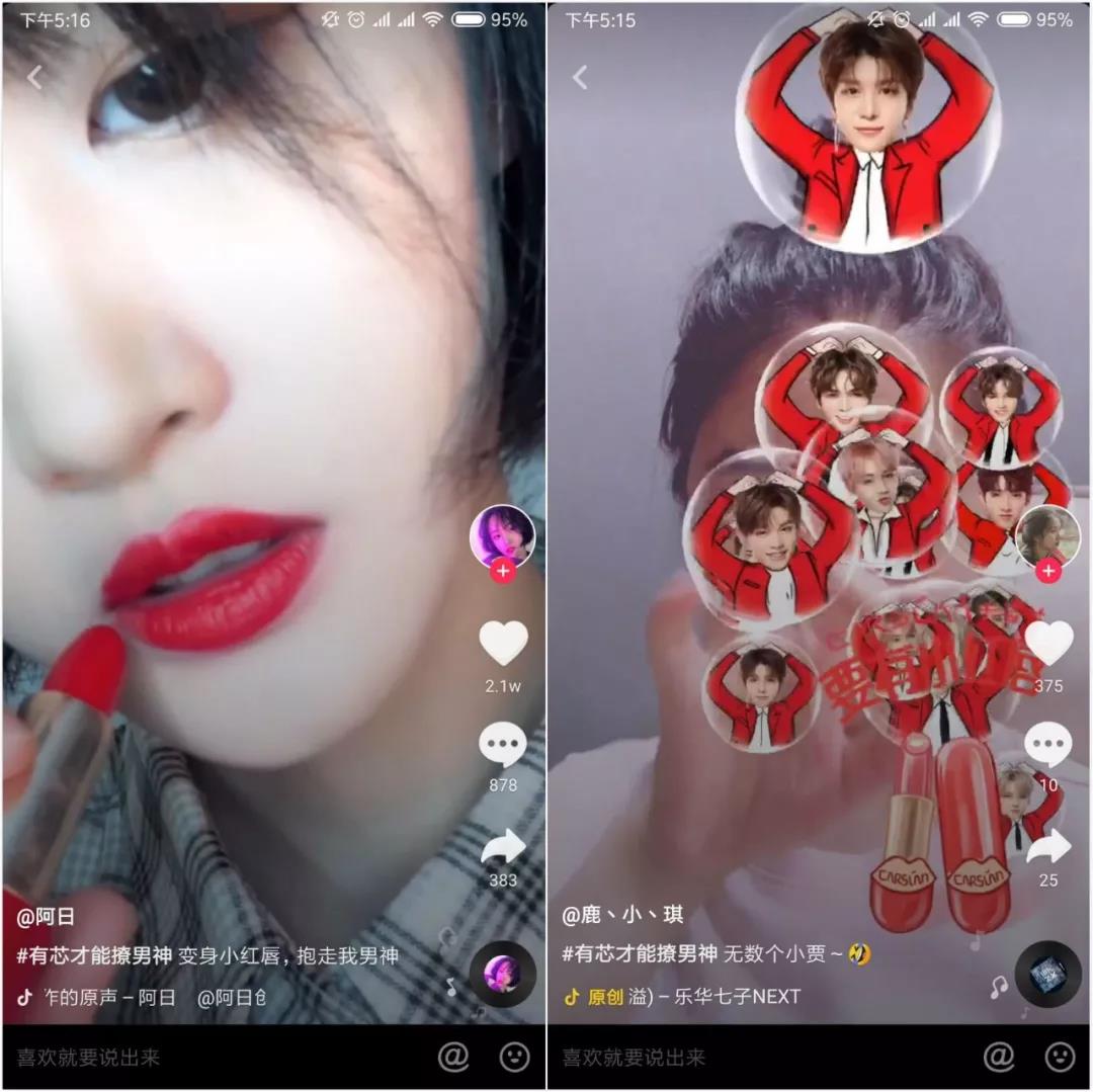 作為抖音3D貼紙商業(yè)化首秀,#有芯才能撩男神#挑戰(zhàn)賽利用互動性極強(qiáng)的3D創(chuàng)意貼紙,引導(dǎo)用戶伸出指尖召喚“樂華七子泡泡球”。泡泡球會跟隨指尖同步移動,撩撥粉絲少女心。同時,貼紙中植入卡姿蘭小紅唇產(chǎn)品形象,深化用戶對產(chǎn)品的認(rèn)知。
