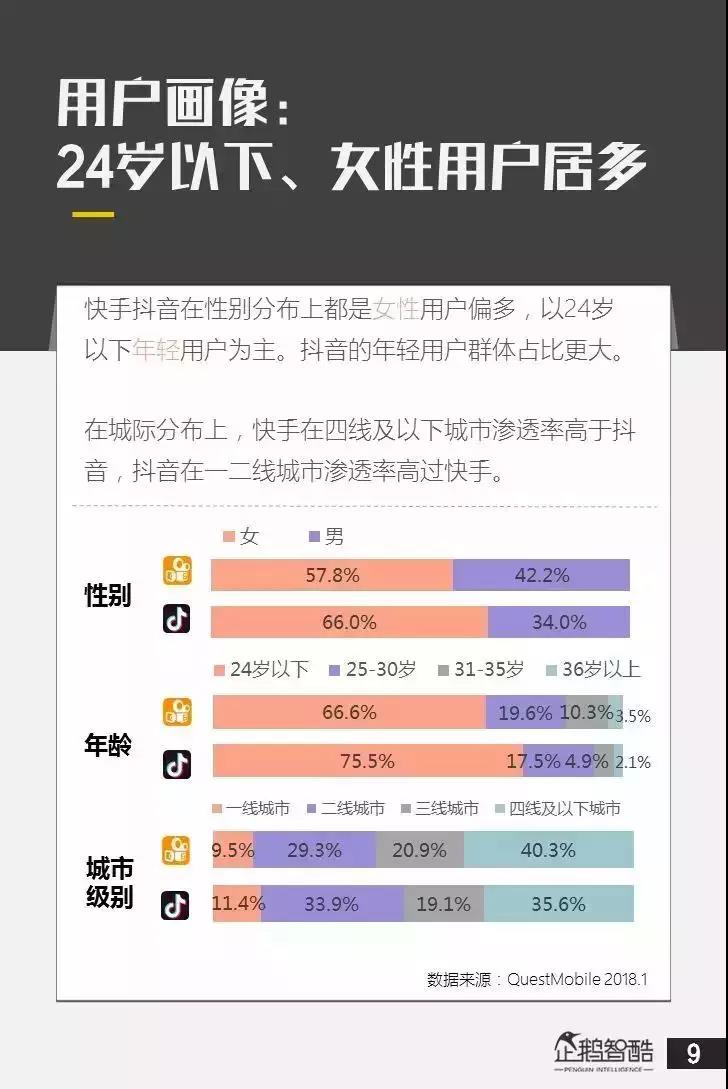 其實,無論是快手還是抖音,女性用戶的群體,都是要遠遠大于男性用戶的。年齡在24歲以下的年輕一代也占據60%~70%數量,這樣的優勢可以說是巨大的。