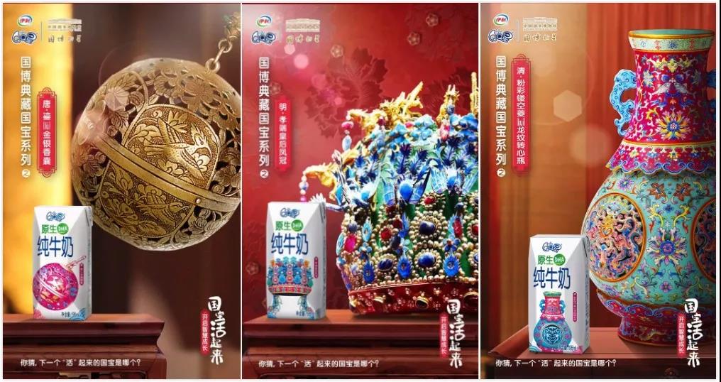 中國國家博物館作為中國優秀傳統文化的聚合體,在當下,對于傳統文化的傳承與發展已經不能僅僅局限于博物館這樣的概念,而是將這些珍貴的傳統文化以一種泛娛樂化的方式傳遞給大眾,尤其是兒童群體。伊利QQ星以助力中國孩子智慧成長的理念發起本次與國寶的跨界合作,讓每一包牛奶都成為文化傳播的載體。沖破包裝視覺的改變和創新是跨界合作的最基礎最原始的利益層,透過基礎的視覺創新,本次伊利QQ星與中國國家博物館的跨界合作更是將核心利益層進行延伸,讓消費者通過購買產品到達精神表達、文化表達、以及趣味互動。融入故事性、AR互動、社交平臺分發等創新點,區別于以往只停留在視覺創新上的泛泛合作。品牌篩選了中國國家博物館中具有高大眾熟悉度的幾件國寶,唐代鎏金香囊、雁魚青銅紅燈、粉彩鏤空轉心瓶和孝端皇后的鳳冠定制成國博典藏國寶系列瓶,并在每包牛奶的國寶圖案中附上了AR功能,打開支付寶掃描出動效講出對應的歷史故事,讓產品本身就成為一個行走的博物館,將伊利QQ星助力孩子智慧成長的理念集中在產品的視覺設計理念中進行傳播。