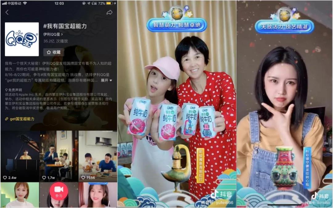 緊接著8月16日,伊利QQ星在抖音發起#我有國寶超能力#為話題的挑戰賽,參與者通過掃描臉部出現匹配的不同的文物, 分別對應無敵活力、神仙顏力、智慧萌力,出現品牌專屬場景AR貼紙,讓有效曝光與創意場景進行結合。多位KOL參與挑戰賽也調動了UGC視頻參與率,截止到8月25日,參與挑戰賽人數達36萬以上,貼紙播放量到達1700萬,挑戰賽播放已達到35億次。